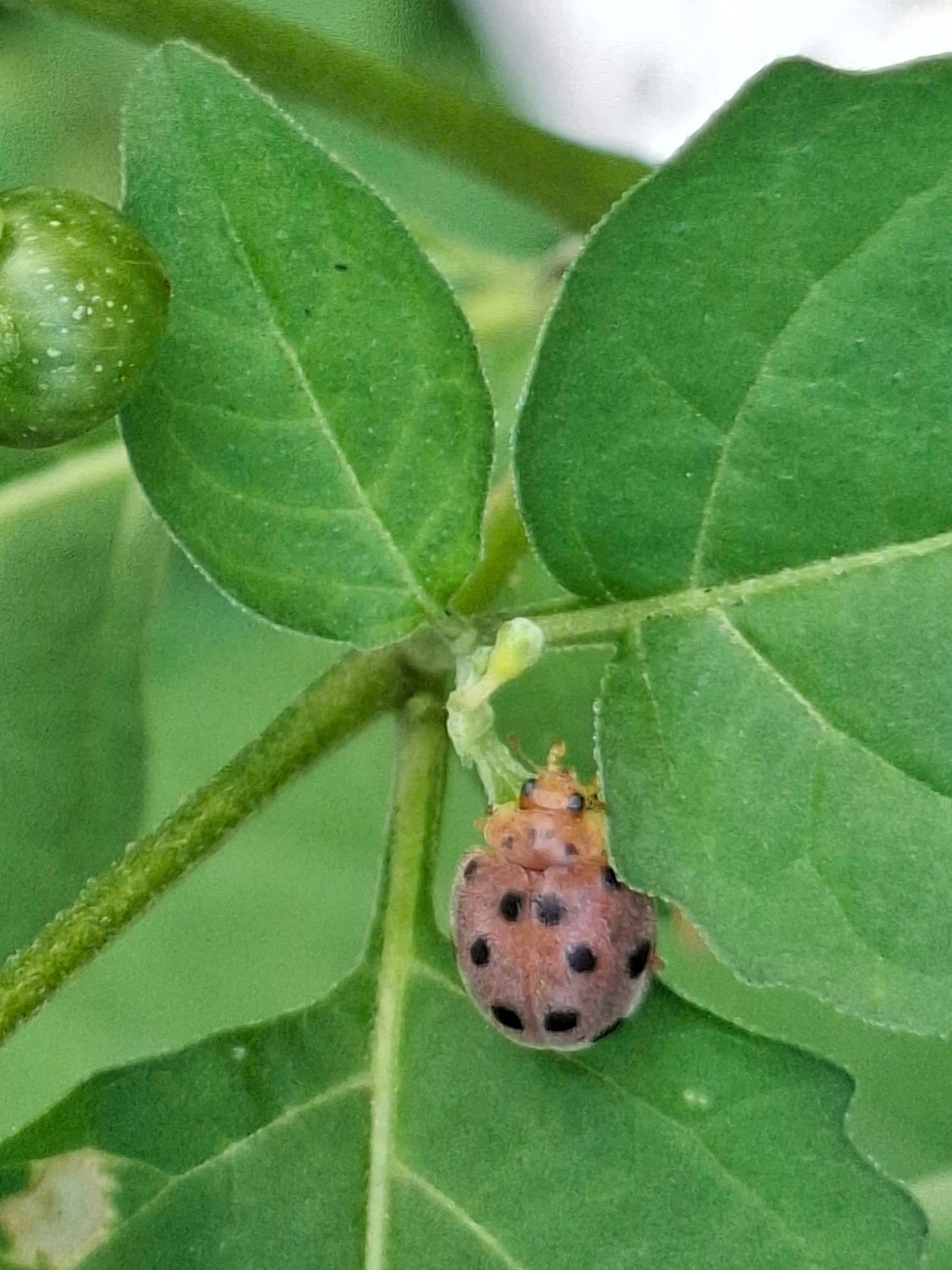 Phát hiện Bọ rùa 12 chấm thuộc họ bọ Rùa (Coccinellidae) đang ăn quả trên cây tầm bóp (Lu lu đực), có tên khoa học Solanum americanum MILL., 1768. Chúng thuộc họ Cà (Solanaceae).