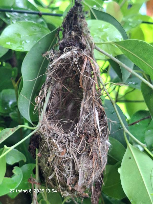 Tổ là một cái túi hình bầu dục một bên như giọt nước, treo lơ lửng, lỗ vào phía trên; miệng tổ hình oval, dài 50 mm, rộng 30 mm; chiều dài toàn bộ tổ từ cuống đến đáy 120 mm. Vật liệu làm tổ gồm nhiều loại thực vật cỏ khô. Bên trong tổ được lót gọn gàng và mềm mại bằng lông tơ. Tổ thường được đặt cách mặt đất khoảng 0,9 đến 1,2 mét, treo dưới cành cây hoặc bụi cây. Trường hợp quan sát ở đây: tổ làm treo trên cành cây Sanh, cách đất khoảng 2m.