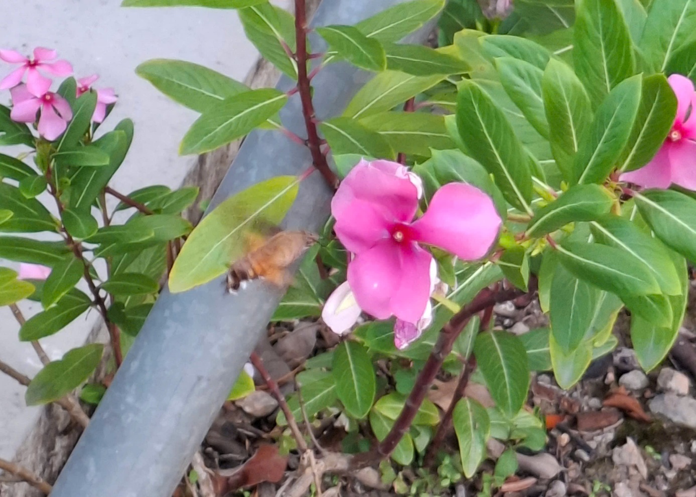 Macroglossum stellatarum đang tiếp cận hoa dừa cạn (Catharanthus roseus)