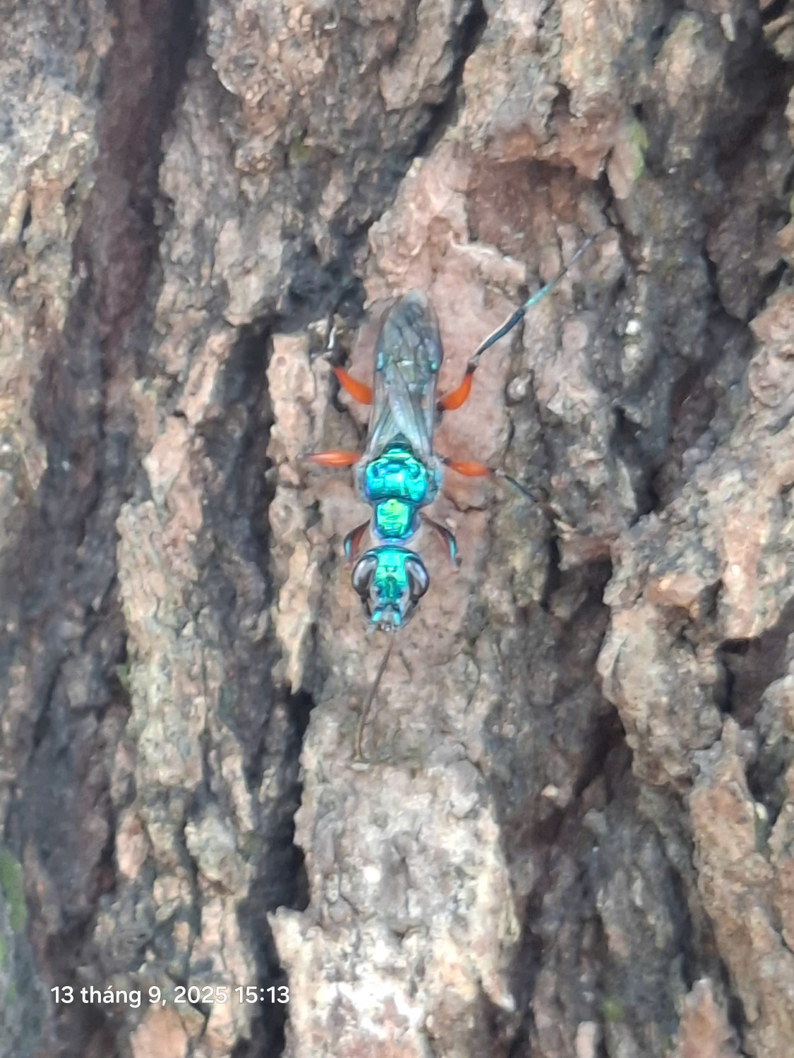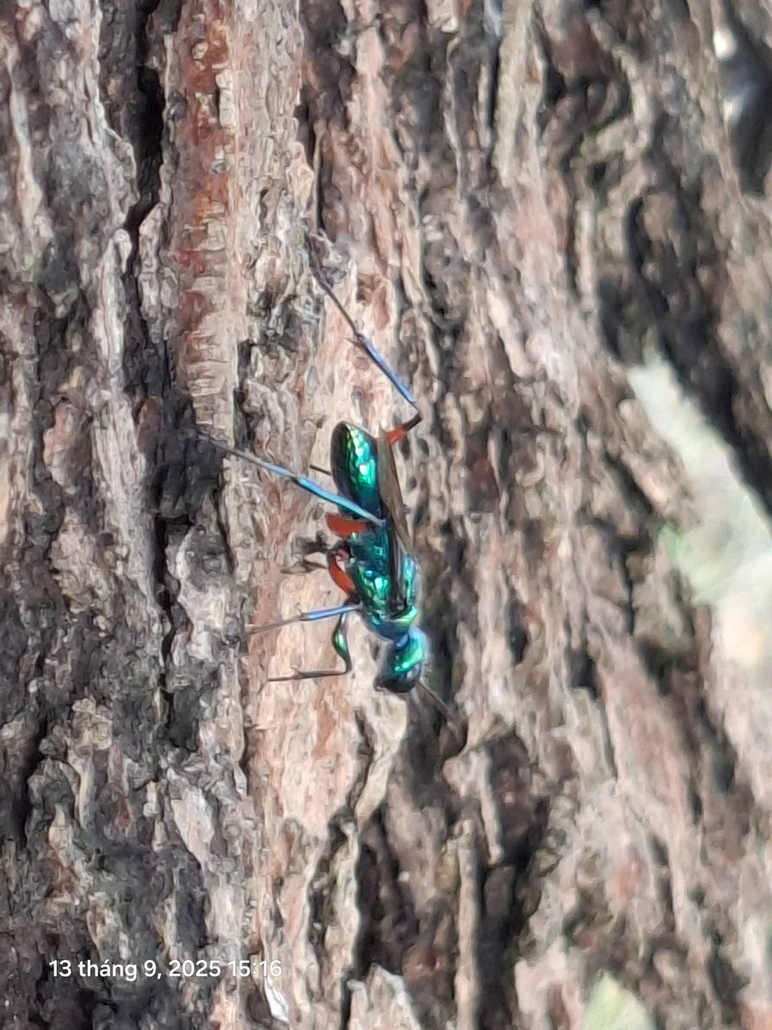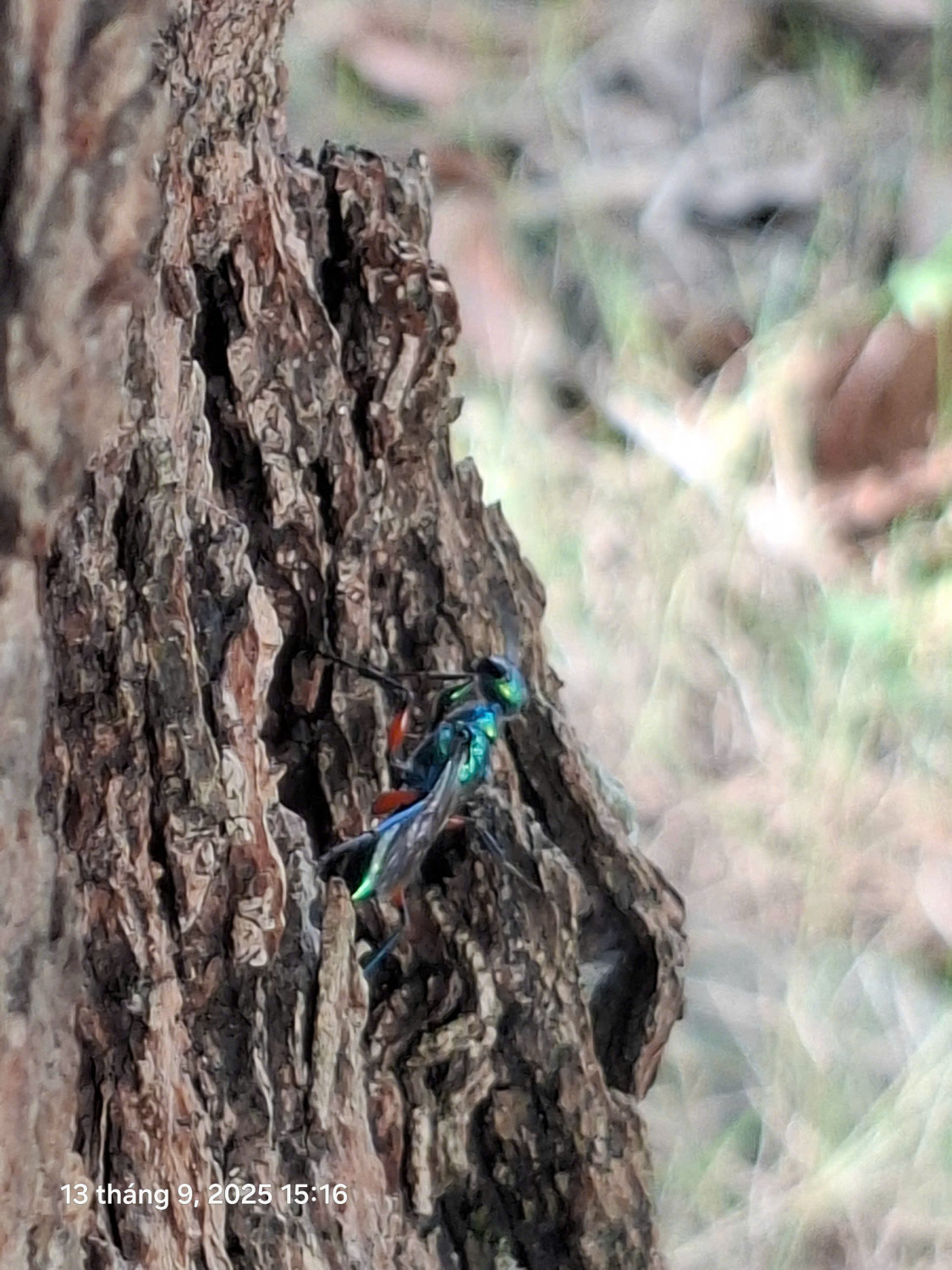 Ampulex compressa trên thân cây Long Não trong khuôn viên trường THPT chuyên Hạ Long (Tên khoa học Cinnamomum camphora (L.) Presl.).