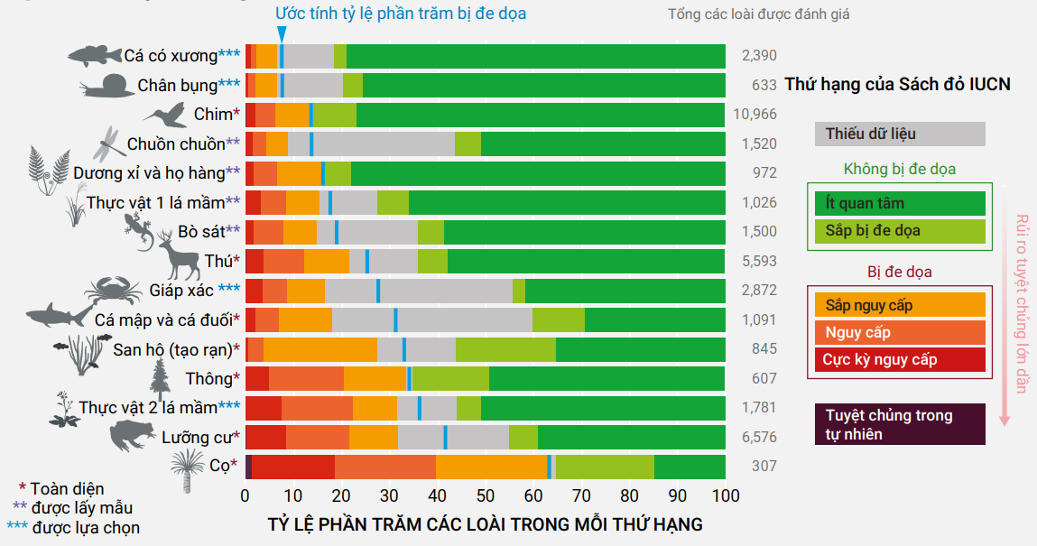 Rủi ro tuyệt chủng hiện tại ở các nhóm loài khác nhau (Theo IPBES)