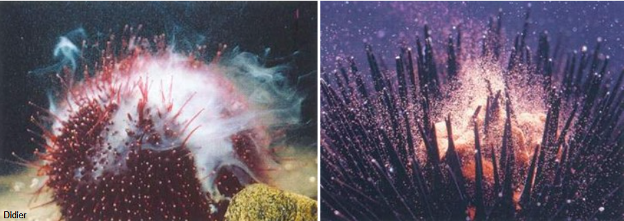 Con đực giải phóng tinh trùng có màu trắng | Con cái giải phóng trứng với màu sẫm hơn |