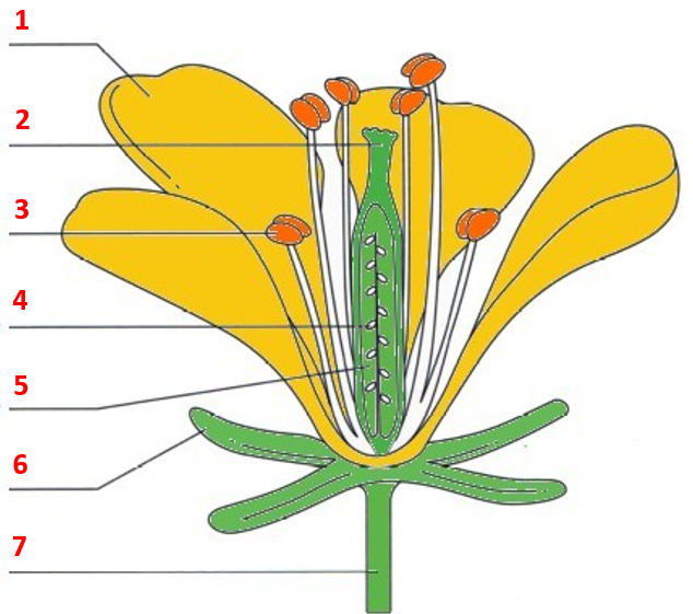 1. Cánh hoa 2. Núm nhụy 3. Nhị hoa 4. Noãn5. Bầu nhụy 6. Lá đài 7. Cuống hoa |